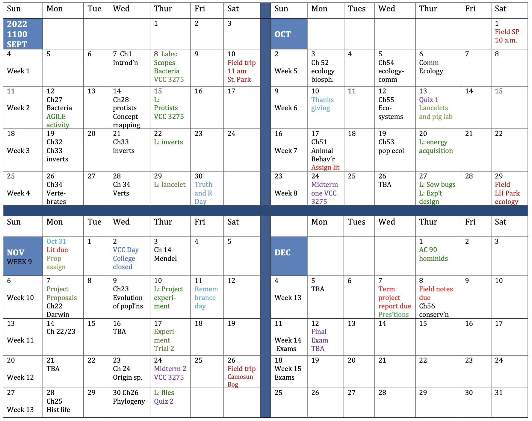 Biology 1200 Daily Schedules