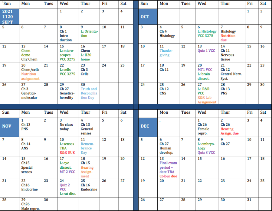 Anatomy & Physiology – BIOL 1120 – Daily Schedules