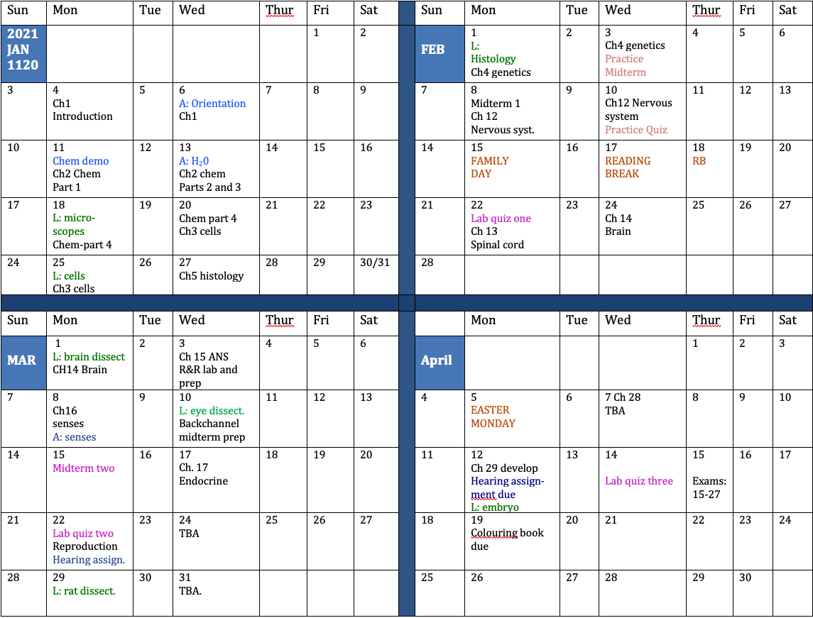 Anatomy & Physiology – BIOL 1120 – Daily Schedules