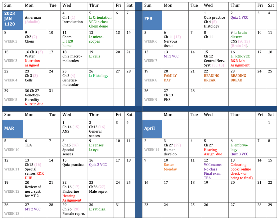Anatomy & Physiology – BIOL 1120 – Daily Schedules