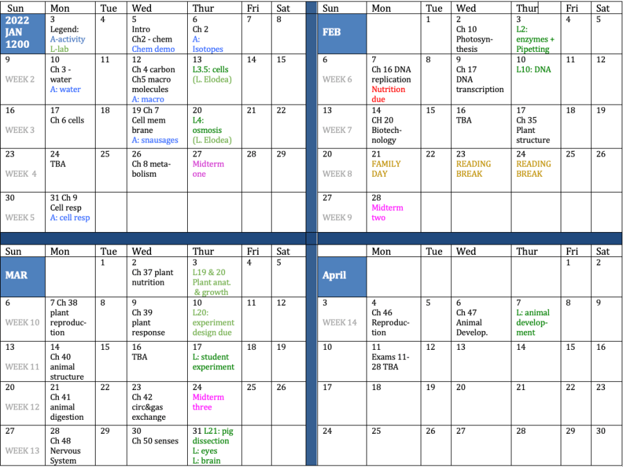 Anatomy & Physiology – BIOL 1120 – Daily Schedules