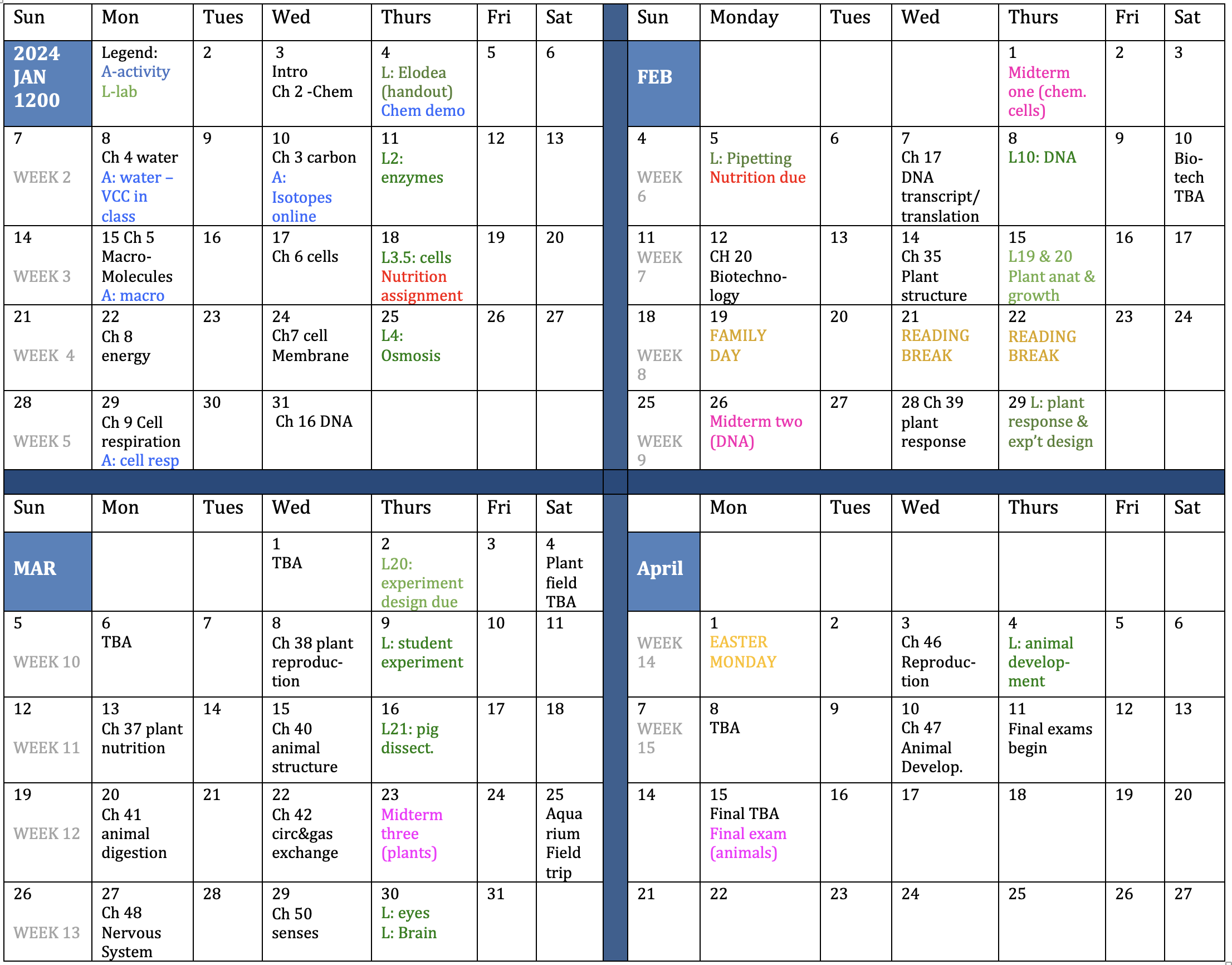 Biology 1200 Daily Schedules