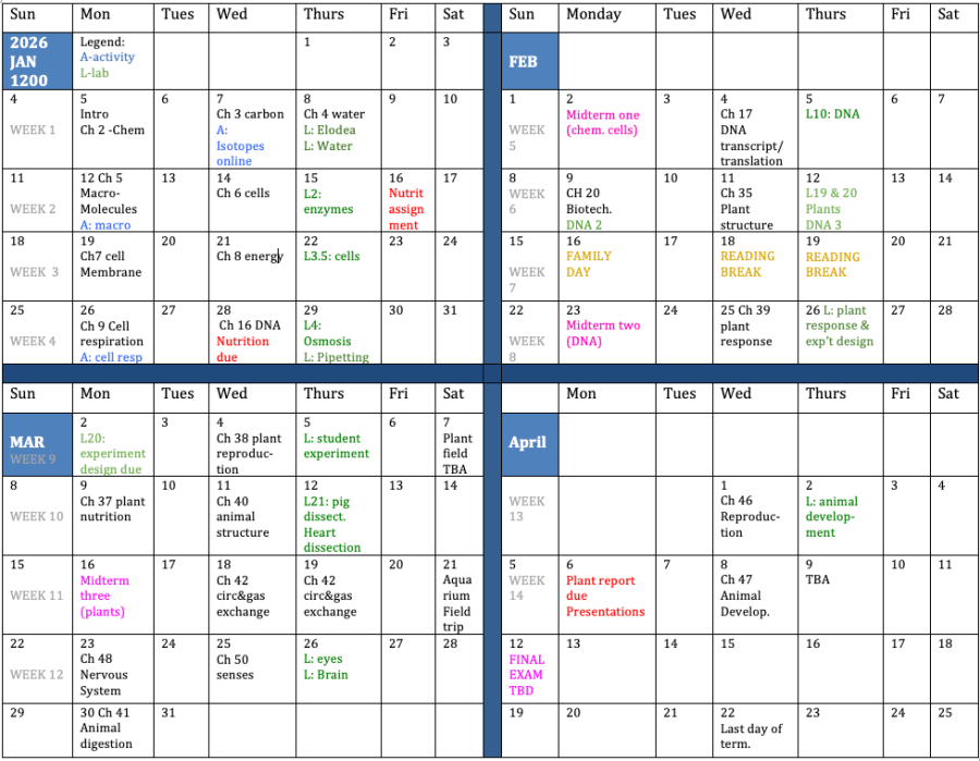 Anatomy & Physiology – BIOL 1120 – Daily Schedules