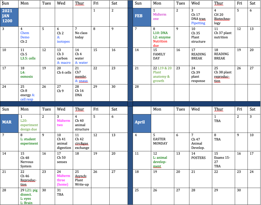 Biology 1200 Daily Schedules